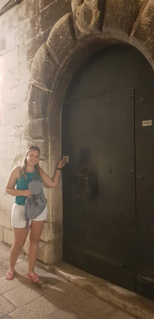 Final de junho, bastante calor, bom período para estarmos lá. Mas essa também é a opinião de muitos turistas, então, fomos preparados para uma cidade lotada. Ficamos hospedados em um AirBnB dentro da parte histórica (murada) da cidade, uma boa escolha pra ficar mais no clima de cidade medieval, bem no meio da área turística, mesmo pagando um pouco mais por isso, e também tendo os turistas fazendo barulho durante a noite toda. O prédio em que ficamos era um edifício que, se não era da era medieval, era bem próximo… portas grandes e pesadas de madeira maciça, uma cisterna logo no hall de entrada. Uma vez dentro do apartamento, todas as facilidades da vida moderna… rs