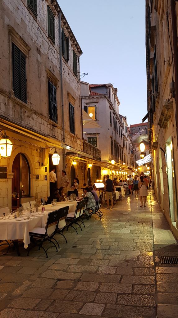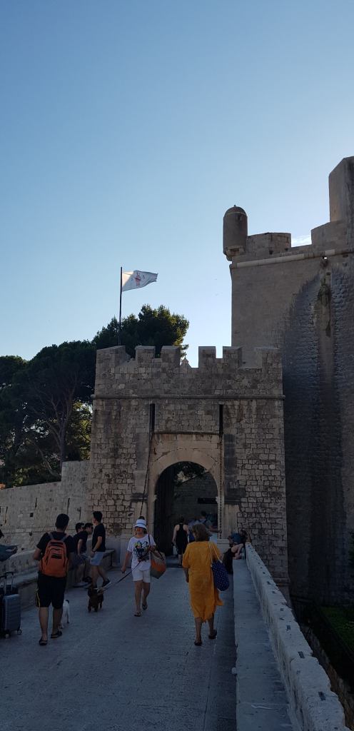 Como costumavam ser as cidades medievais, a parte histórica/turística de Dubrovnik é uma cidade toda murada, o que dá um charme adicional. Há inúmeros portais de entrada na cidade, que “cresceu para fora das muralhas, em particular nas encostas e ao longo do litoral. Dubrovnik fica numa parte da Croácia que é uma “tripa” de litoral, limitado pelo mar por um lado, e pela Bósnia e Hezergovina do outro, nas montanhas. Essa “tripa” inclusive é separada da outra parte da Croácia por uma parte da Bósnia, ua situação interessante. Quando saímos de Dubrovnik para irmos para Sarajevo, fomos de ônibus e cruzamos as fronteiras algumas vezes pelo caminho…