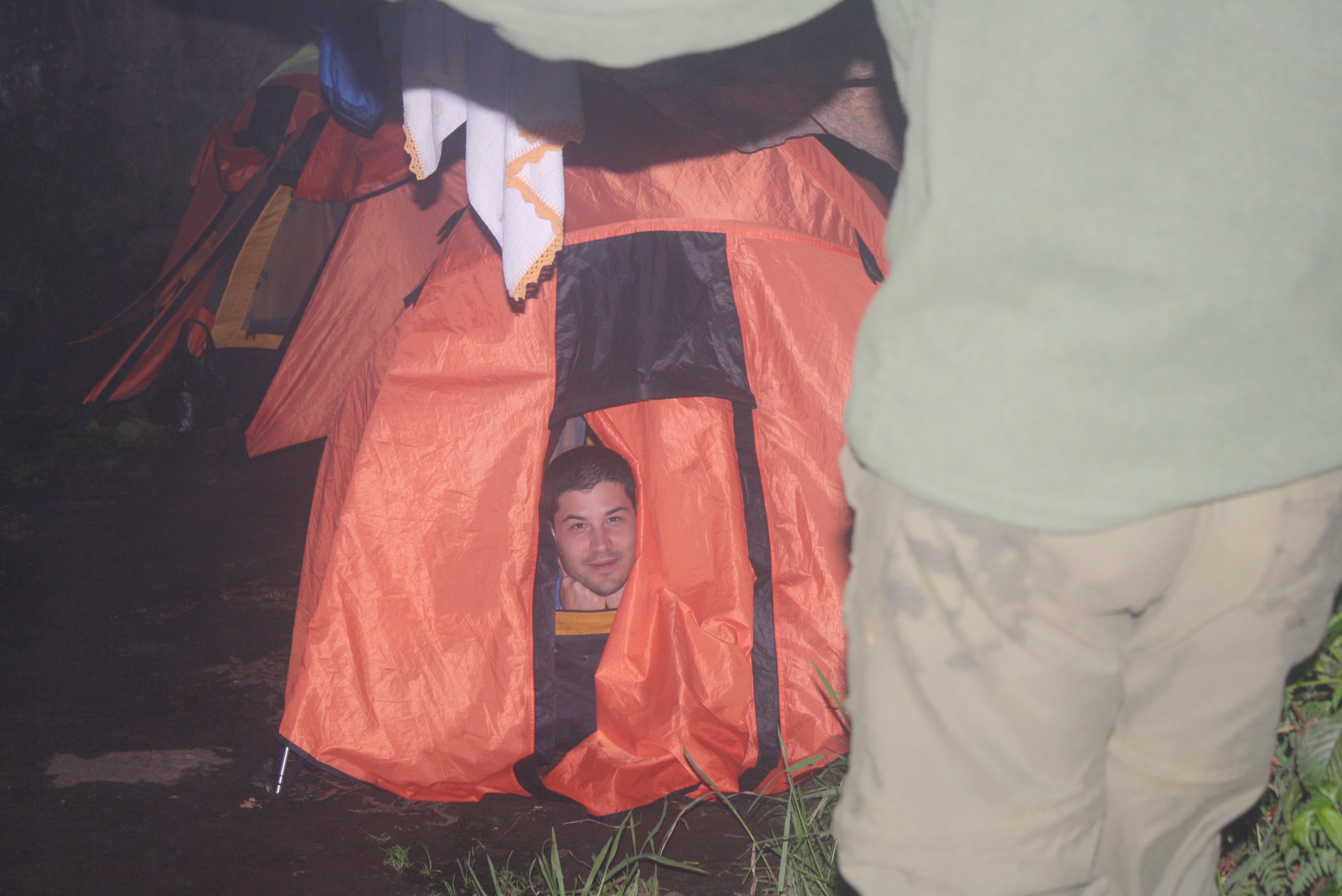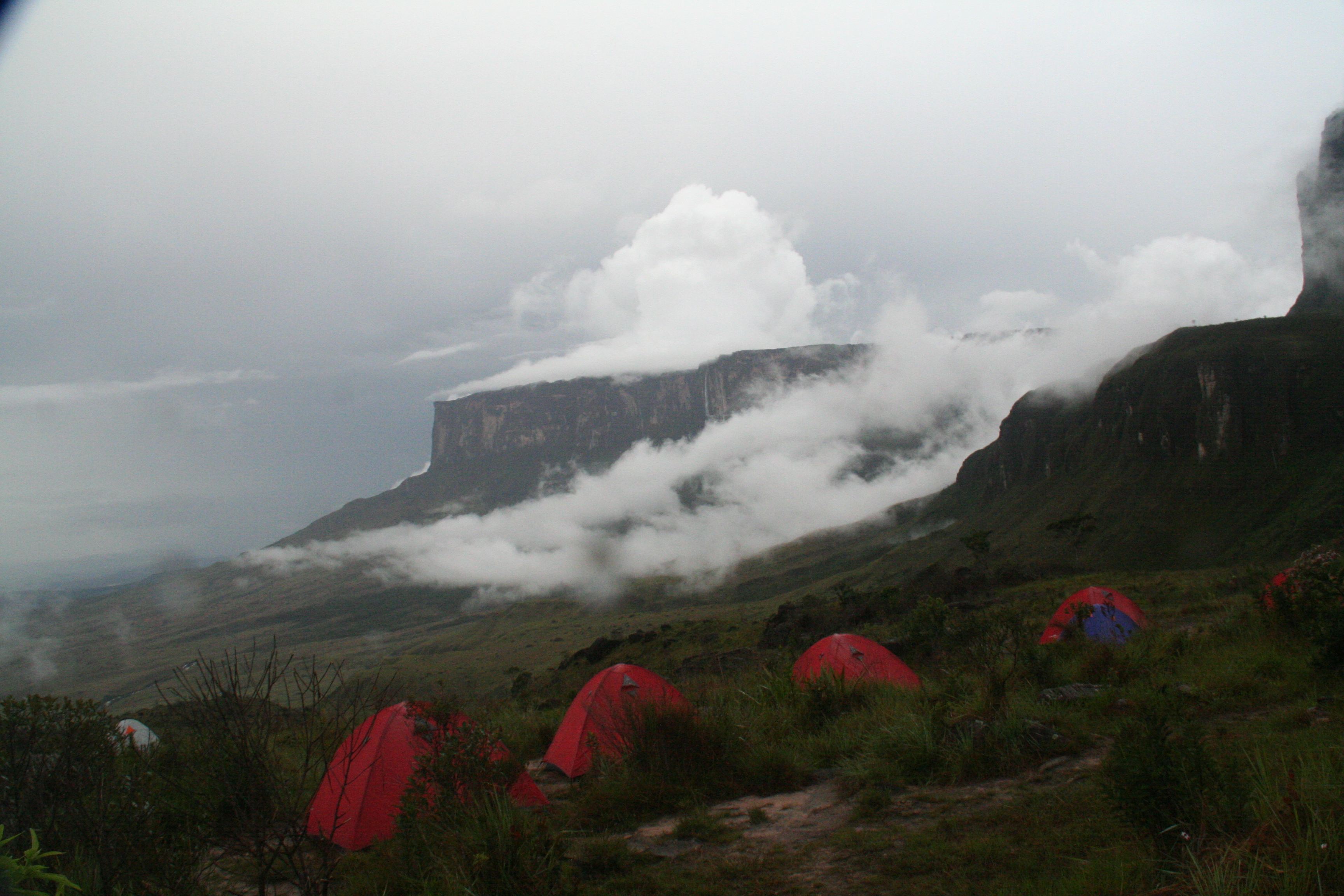 Como todos os dias, acordamos cedo, arrumamos as coisas, tomamos café da manhã e… começar a caminhar! Aliás, todas as refeições ficavam por conta dos carregadores, uma turma nota 1000, conforme pudemos constatar ao longo dos dias (mais detalhes à frente). Não tenho fotos dessa subida, porque foi o dia em que começamos a sentir na pele – literalmente – o clima da região. Choveu bastante, em praticamente toda a nossa subida. Vários momentos em que eu sentia a água escorrendo pelo pescoço, por dentro do anorak impermeável, descendo pelo corpo todo, molhando até as meias. É daqueles momentos em que você tem certeza de que gosta desse tipo de passeio, ou não. No meu caso, só me dava vontade de continuar caminhando e chegar ao topo. Vinha água do céu, escorria pela lateral da montanha, formando pequenas cascatas, vinha pela lateral quando ventava, enfim, de todos os lados.