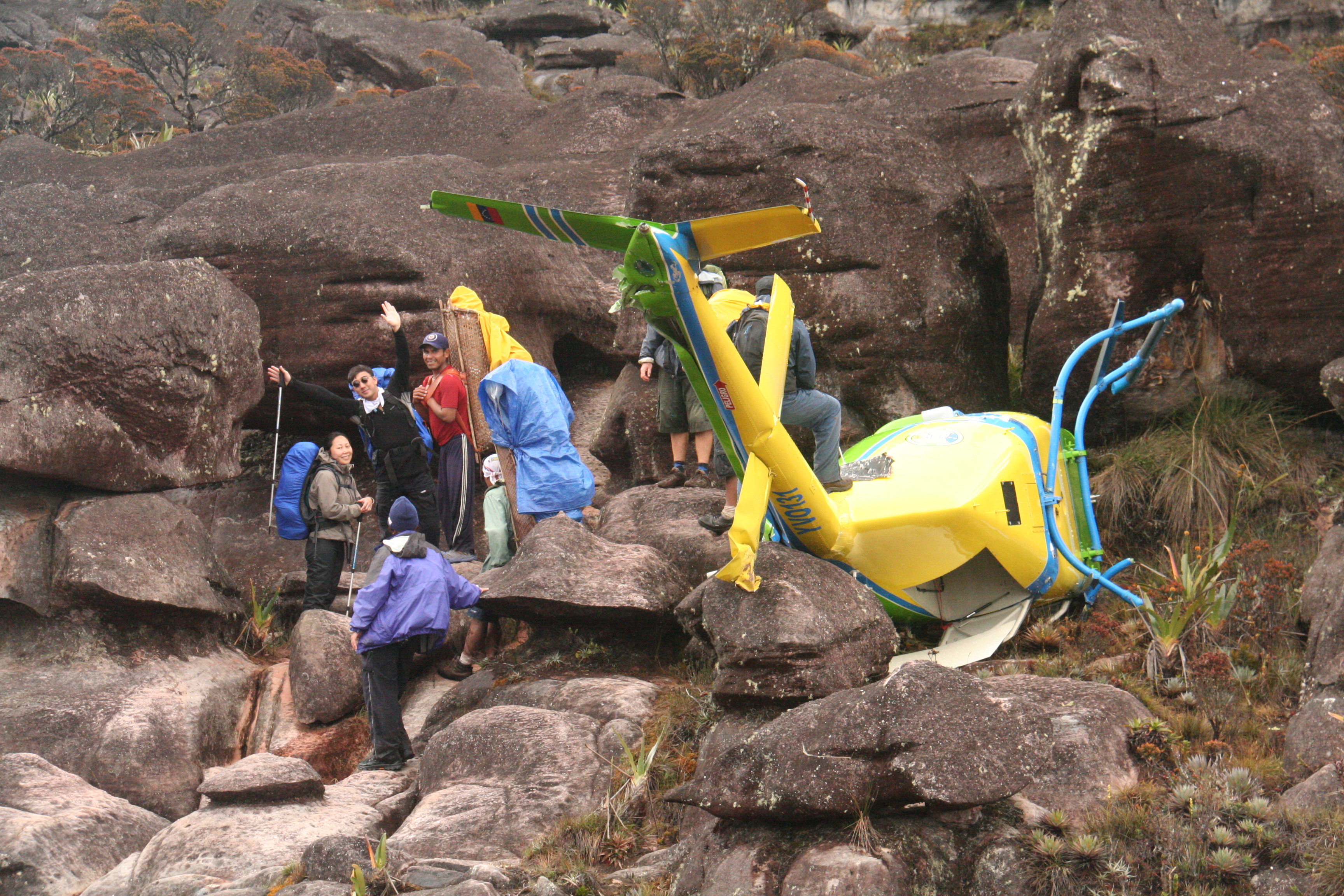 Ao terminar a subida fomos premiados por um tempo melhor, com neblina mas sem chuva. A sensação de chegar lá em cima é indescritível. Logo na subida já vimos um helicóptero caído. Explico: qualquer resgate que tenha que ocorrer na região tem que ser feito de helicóptero. Alguns dias antes da nossa chegada um turista havia se acidentado no final da subida, e para seu resgate chamaram o helicóptero. Consta que o piloto oficial estava ausente no dia, e mandaram o reserva. A aproximação do topo é crítica por conta da neblina e ventos. Resultado, o helicóptero caiu e ficaram os dois (turista e piloto) aguardando o próximo. Ficamos sabendo que além daquele haviam mais dois abandonados lá em cima, um do exército brasileiro, e outro da Rede Globo, que caiu com o então apresentador do “Globo Ecologia”, Danton Melo, em 1998. Melhor mesmo é ir caminhando, e não precisar de resgate… Pelo sim, pelo não, eu particularmente havia contratado um seguro viagem que cobria o resgate de helicóptero, pelo qual sem o seguro seriam necessários uns R$ 2 mil, na época.