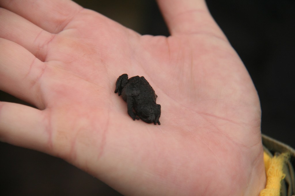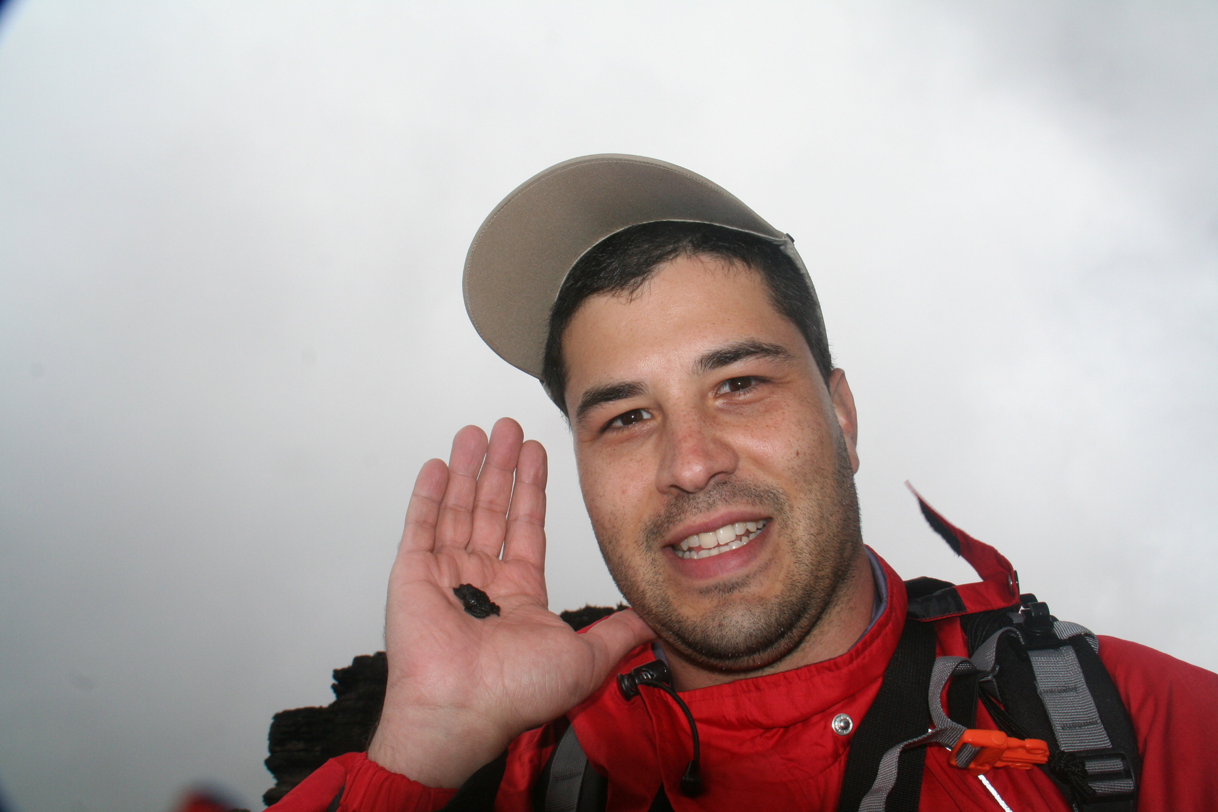 O visual lá em cima por onde caminhamos é bem diferente da chamada “savana” por onde havíamos passado nos dias anteriores. Muita rocha vulcânica, escura, e vegetação rala. Conforme falei anteriormente, algumas plantas e animais são endêmicos, ou seja, só existem lá em cima e em nenhum outro lugar do mundo. Um famoso habitante que encontramos logo no primeiro dia foi o “sapinho do Roraima” (Oreophrynella quelchii), um sapo pequeno (veja foto) que não salta, e faz a alegria dos turistas para fotos.