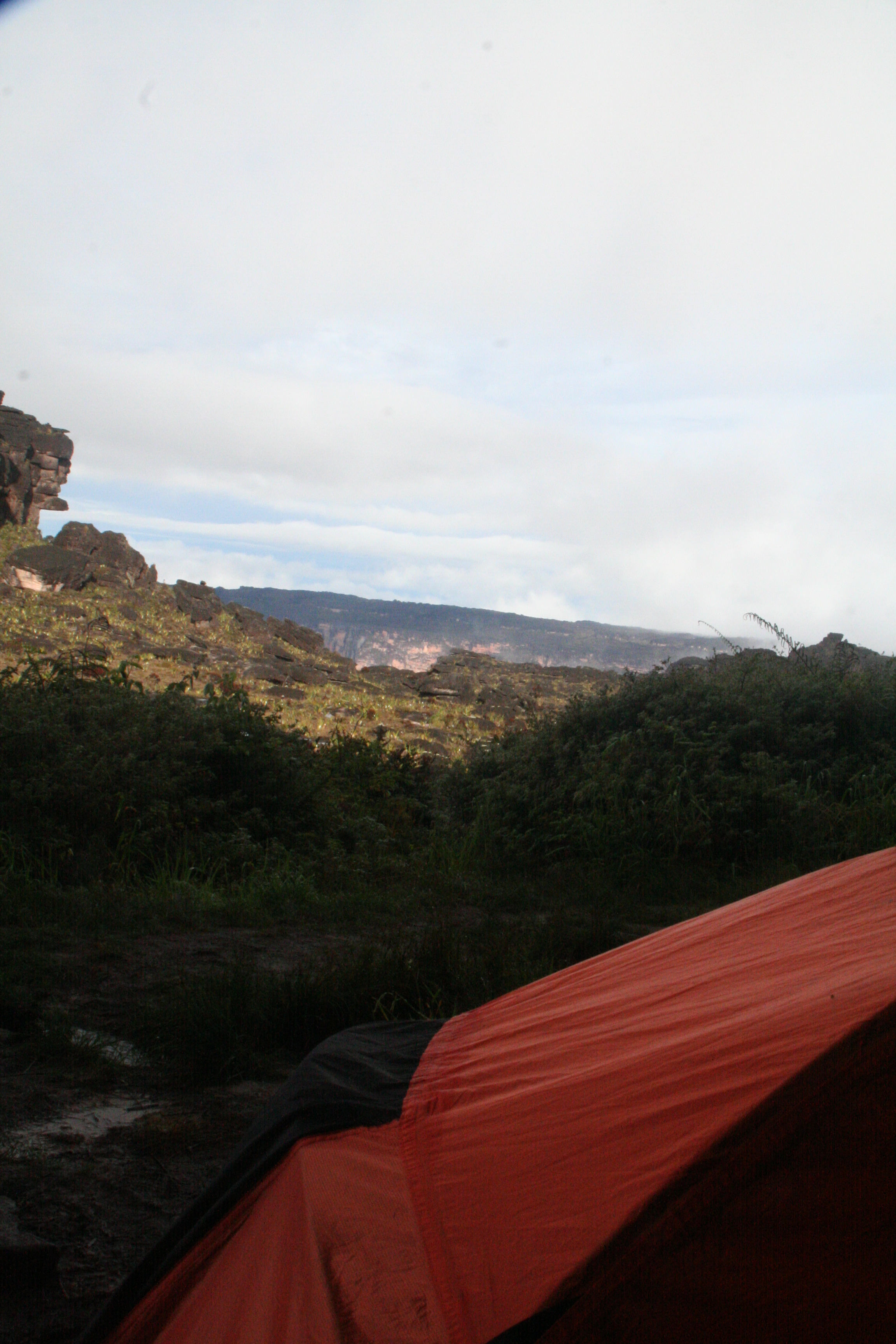 Uma vez lá em cima, seguimos caminhando até nosso ponto de acampamento. E a lógica é a seguinte: quem chega primeiro pega os melhores locais. Na medida em que acampamentos vão sendo desmontados e liberados, os guias comunicam-se entre si. Dessa forma, se seus guias são bem relacionados entre os pares, boas chances de conseguir um bom acampamento. Caso contrário… Felizmente, nossos guias eram bem relacionados e conseguimos (segundo nos disseram) um dos melhores pontos, na encosta de uma das formações rochosas lá em cima. Com mais de 30km2 de área, tem bastante lugar para acampar…