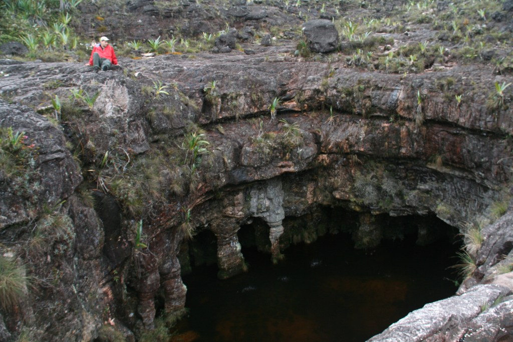 No primeiro dia explorando o topo, fomos para o chamado Vale dos Cristais, onde o chão é coberto por – adivinhe! – cristais, passamos no marco da Tríplice Fronteira (Brasil, Guiana e Venezuela), e terminamos o dia no chamado “El foso”, um lago com uma pequena cascata. Local de banho, que pode ser acessado pela forma rápida (pulando lá de cima) ou lenta (dando a volta e entrando por baixo. Eu optei pela forma lenta, não estava com pressa… E ao longo do caminho visuais incríveis com formas esculpidas pela natureza ao longo dos anos que nos fazem imaginar animais, figuras humanas ou quaisquer outras que a imaginação permitir.