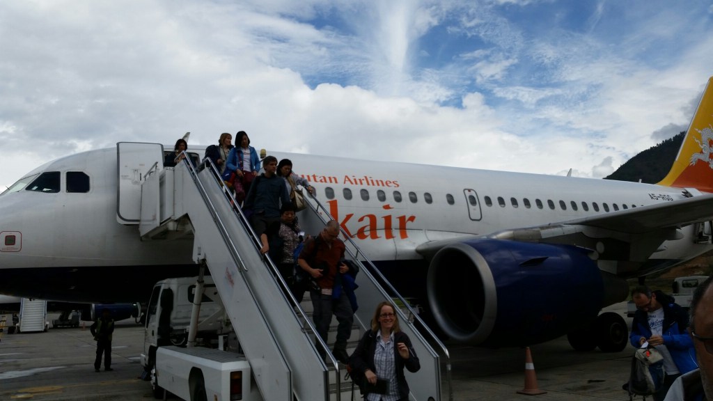 A primeira parte da aventura foi a descida no aeroporto de Paro, vindo de Kathmandu pela Drukair, companhia aérea butanesa. A aventura não foi por conta do avião em si, um Airbus 319 comum como os que costumamos utilizar em voos internos no Brasil. A questão é que o aeroporto é um dos mais difíceis de se pousar no mundo (existem menos de 10 pilotos treinados para pousar lá), pois ele fica num vale cercado por enormes montanhas a cerca de 5000 metros de altitude. Ao baixar das nuvens, o avião vai desviando literalmente das montanhas enquanto desce. Seria quase o equivalente a descer em Congonhas, São Paulo, tendo que ziguezaguear entre os prédios. Claro que com uma distância segura, mas foi uma experiência bem diferente.