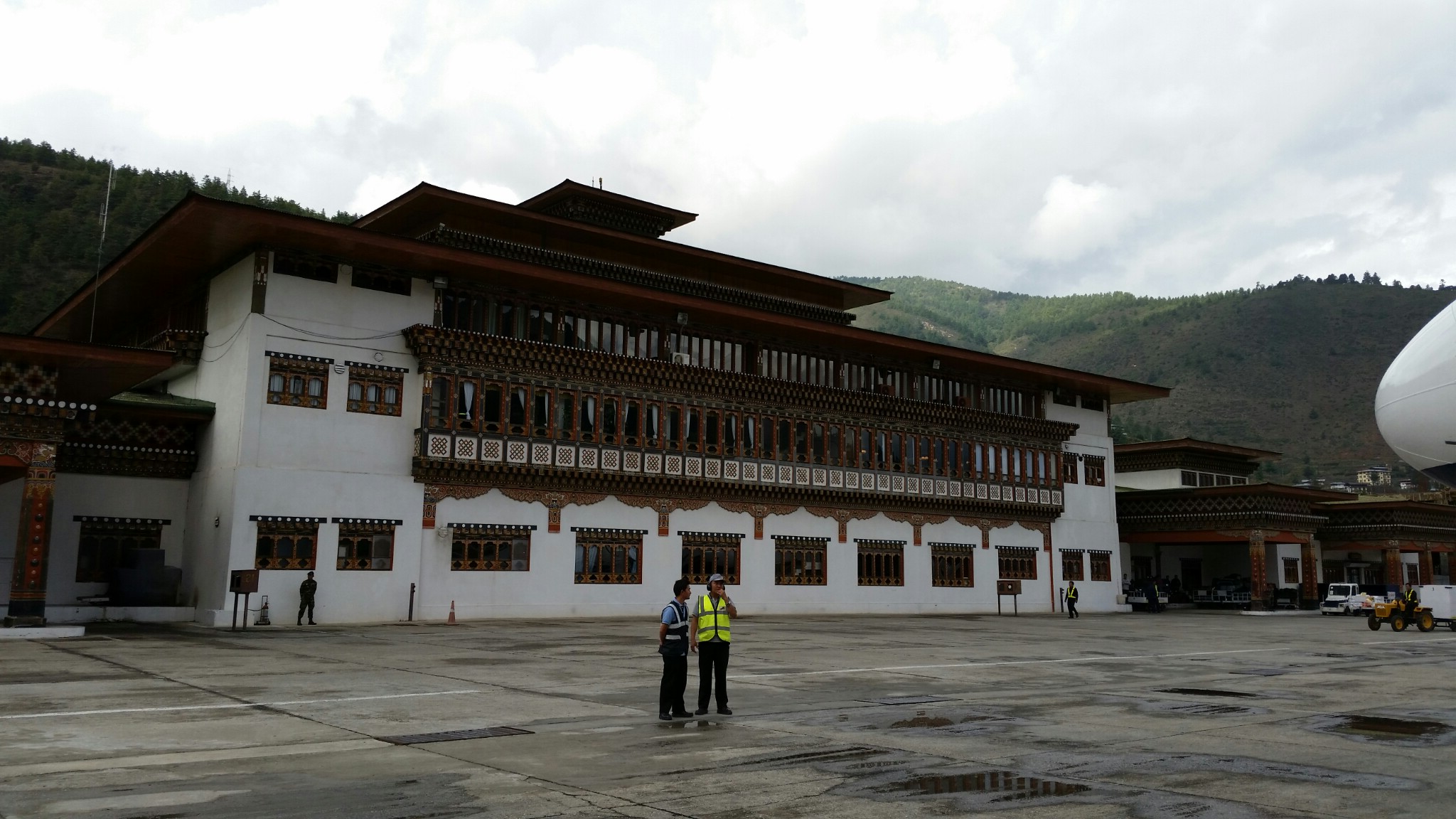 A primeira parte da aventura foi a descida no aeroporto de Paro, vindo de Kathmandu pela Drukair, companhia aérea butanesa. A aventura não foi por conta do avião em si, um Airbus 319 comum como os que costumamos utilizar em voos internos no Brasil. A questão é que o aeroporto é um dos mais difíceis de se pousar no mundo (existem menos de 10 pilotos treinados para pousar lá), pois ele fica num vale cercado por enormes montanhas a cerca de 5000 metros de altitude. Ao baixar das nuvens, o avião vai desviando literalmente das montanhas enquanto desce. Seria quase o equivalente a descer em Congonhas, São Paulo, tendo que ziguezaguear entre os prédios. Claro que com uma distância segura, mas foi uma experiência bem diferente.