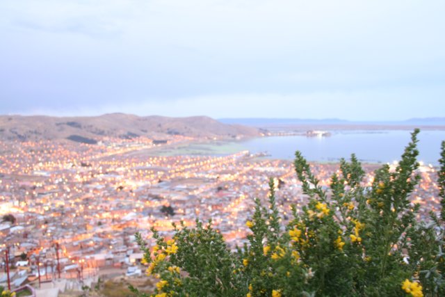 No nosso primeiro dia, praticamente só viagem: saímos de São Paulo de madrugada, chegamos em Lima e ficamos no aeroporto aguardando o embarque para Juliaca. Chegando em Juliaca, fomos levados de van para Puno, no hotel Sillustani. No caminho, tivemos nossa primeira impressão do Peru: Juliaca é uma cidade que nos chamou a atenção Vista de Puno a partir do mirante do Condorpor ser muito povoada e muito confusa, em matéria de trânsito, muitas pessoas na rua, ruas lotadas de camelôs, bicicletas e pedestres disputando espaço nas ruas com os carros, uma verdadeira bagunça. Depois de chegarmos ao hotel em Puno, saímos à noite para conhecermos a cidade, que fica na beira do Lago Titicaca. Puno é uma cidade bem pequena, que ainda engatinha na exploração do turismo. Alguns bons restaurantes, alguns museus, um belo mirante (Mirante do Condor), que dá uma visão do Lago (parcial, porque o lago é enorme). Tem uma escadaria enorme para chegar lá em cima (mais de 4000 metros de altitude), mas vale a pena.
