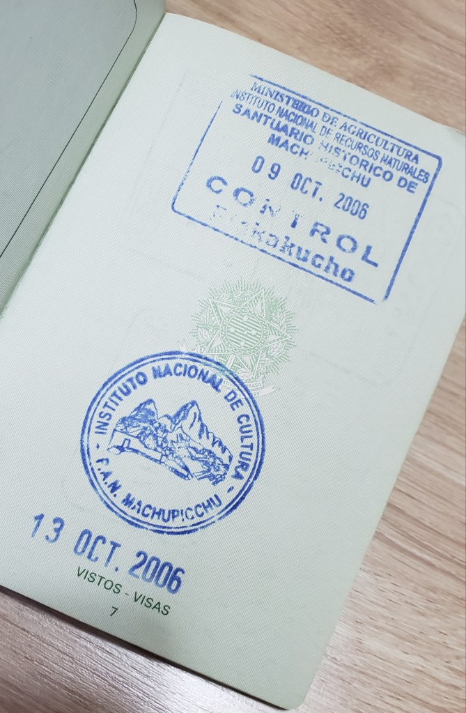 Carimbos de entrada na trilha (09/out) e entrada via Águas Calientes (13/out)
