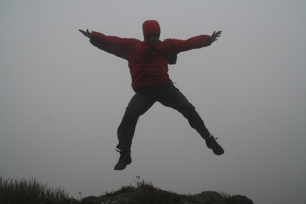 Depois da primeira noite acampados, mal dormida e com muito, muito vento, seguimos até o pé do Pedra da Mina. Acampamos por lá para subirmos no dia seguinte. Dependendo do tempo, seguiríamos para o vale e depois ao Pico dos 3 Estados, ou abortaríamos, descendo da Pedra da Mina e voltando a Passa Quatro pela descida do Paiolinho. No jantar, arroz com farofa mineira, com bacon e linguiça defumada… 😛 Muita conversa, um tanto de pinga com mel só para aquecer, e vamos dormir… uma noite pior do que a anterior, com ventos que até chegaram a derrubar uma das barracas às 3 da manhã. No dia seguinte, tempo só piorando, ventos cada vez mais fortes e muita neblina. Na subida, os ventos estavam cada vez piores, cerca de 70 km/h, que nos derrubaram por várias vezes. As rajadas ainda traziam muita umidade, o que dava o efeito de uma chuva lateral bem forte, nos molhando bastante. Todos juntos, com muita determinação, conseguimos subir ao topo, ficamos muito pouco tempo lá em cima por conta do clima (frio e vento muito forte, anunciando chuva), e em seguida começamos a difícil descida pelo Paiolinho, abortando o resto da caminhada por conta da chuva forte que segundo o nosso guia, iria cair no final do dia. Ao final da descida, após mais de 6 horas praticamente ininterruptas de caminhada, uma miragem: um boteco com 4 frangos assados e muitas garrafas de cerveja… para a turma cansada, um verdadeiro banquete… E, com a sensação de um desafio vencido, apesar de não termos completado a travessia, voltamos à civilização.